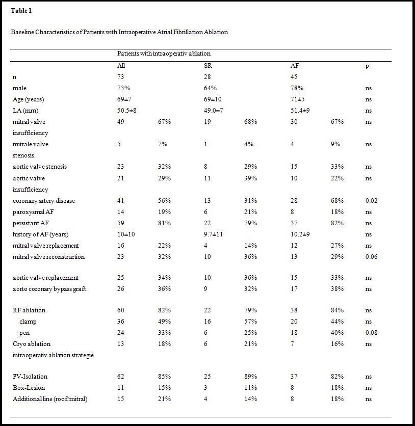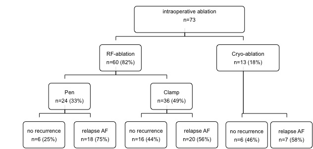 60 (82%) of 73 patients with surgery for mitral valve (53%), aortic valve (34%), and coronary artery disease (36%) - or a combination of these - underwent intraoperative ablation with RF energy and 13 patients (18%) with cryo (Table 1). RF-ablation was performed with a pen in 24 (33%) and by use of a clamp in 36 patients (49%). In all patients PV were isolated, in 11 cases (15%) using a box lesion and 15 patients (21%) received an additional roof- and mitral-isthmus line (Table 1).