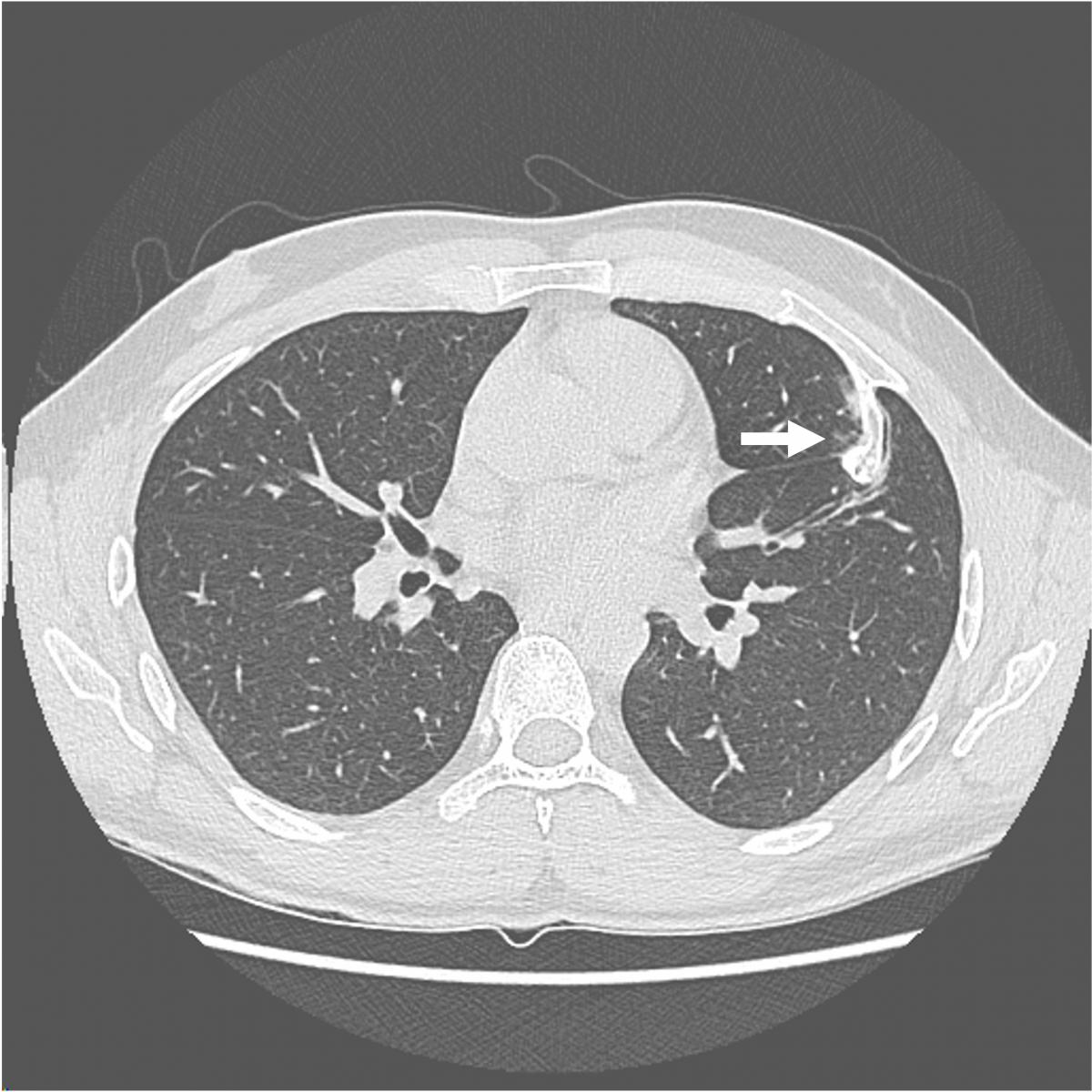 Physical examination was notable for an outwardly normal chest wall with no palpable abnormalities. The patient carried a history of multiple exostoses syndrome with multiple prior resections of long bone osteochondromas from infancy until 20 years of age (1). His family history was significant for multiple first-degree relatives with multiple exostoses syndrome.