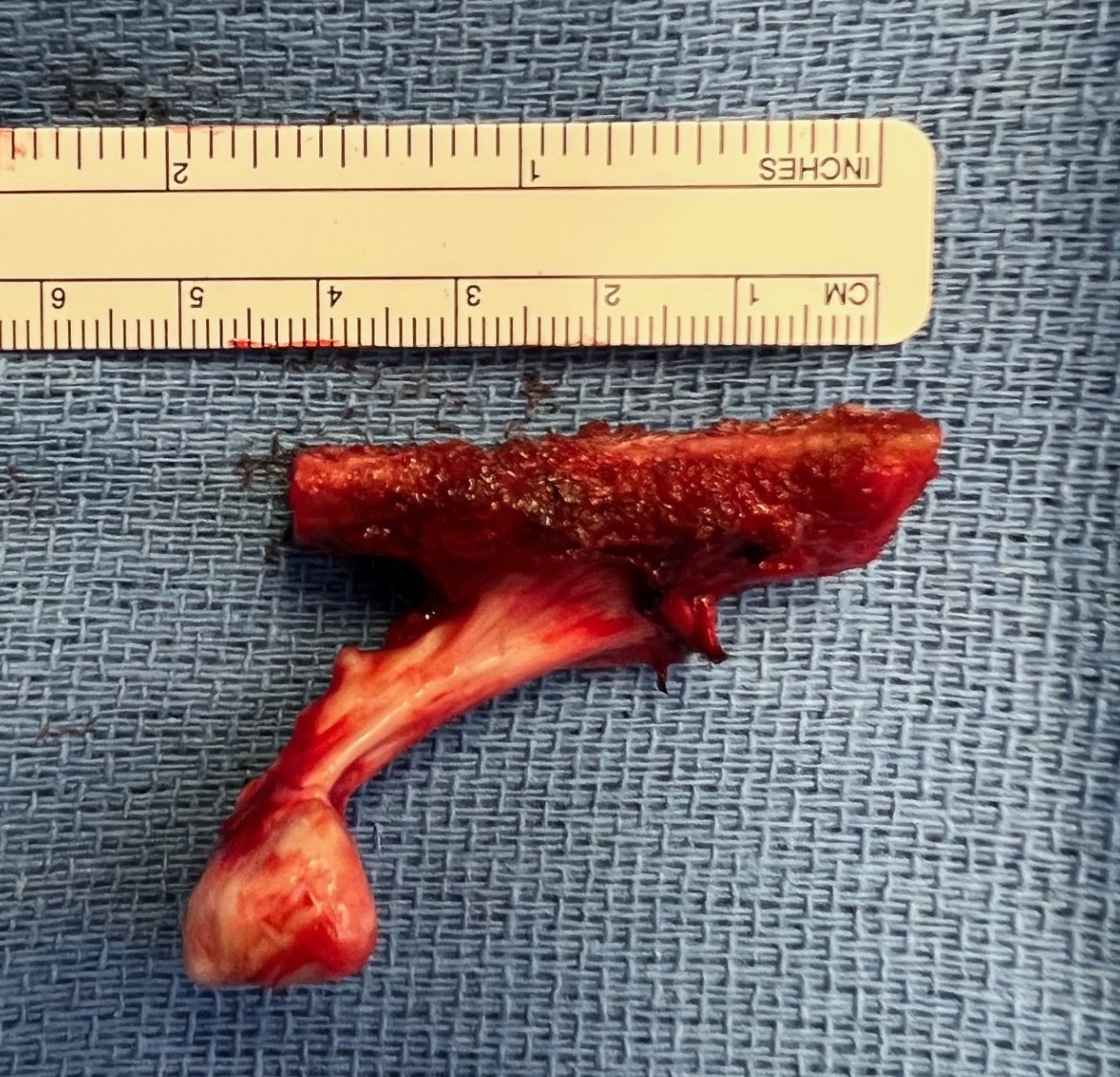 Surgeons made an inframammary incision, splitting the pectoralis fibers longitudinally and carrying the dissection down to the chest wall. A finder needle was used to identify the correct rib and the anterior and posterior transection points, minimizing the extent of the removal. Surgeons then performed a rib resection, electing to forgo chest wall reconstruction given the location and small size (Figure 3). The patient recovered well and was discharged home on postoperative day one.