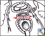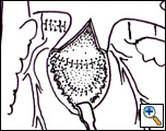 A standard median sternotomy is performed followed by initiation of cardiopulmonary bypass with bicaval cannulation.  Under moderate hypothermia (28 degrees Centigrade) the proximal coronary arteries are mobilized and the aortic root is harvested from the right ventricle (RV) (Figure 1, left).  Alternatively, cardioplegic arrest can be instituted and the coronary artery buttons harvested from the aorta before proceeding with the mobilization of the aortic root.