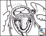 Figure 2: Left: the posterior half of the aortic annulus is sutured to the pulmonary valve annulus.  Right: the ventricular septal defect is closed with a patch, which is also sutured to the anterior rim of the proximal aortic root.