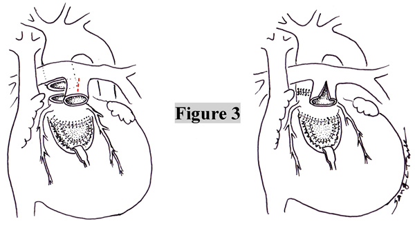 The pulmonary artery is transected proximally, the pulmonary valve is resected and the conal septum divided (Figure 1, right).  The aortic root is then translocated posteriorly and sutured to the pulmonary valve annulus posteriorly (Figure 2, left) and to the crest of the VSD (or the VSD patch) anteriorly (Figure 2, right).  The coronary arteries, if detached, are then reimplanted.