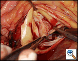 - The aortotomy is closed with a running 4-0 polypropylene suture over and over in a double layer with Teflon felt pledgets at both ends to buttress the suture line. In the case of complete transection of the aorta a continuous running 4-0 polypropylene suture is used. The cross clamp is removed. The heart is de-aired and the patient weaned from cardiopulmonary bypass.