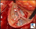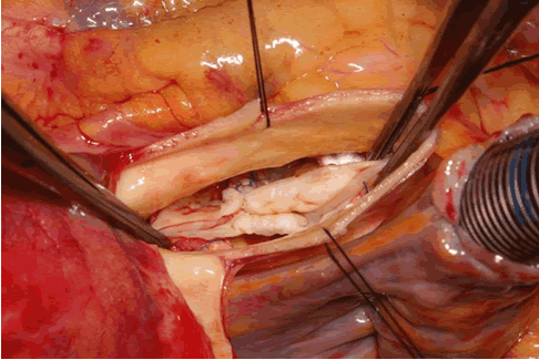 - After establishing cardiopulmonary bypass, a transverse aortotomy is performed 2 cm above the sinotubular junction. For better visualization, the aorta can be completely transected and suspended with stay sutures positioned above the commissures to better visualize the anatomy.