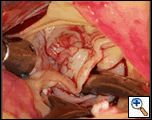 - An autologous pericardial patch is prepared and used to cover the defect with either running or interrupted 6-0 polypropylene suture. (Figure 4). Avoid the urge to close this defect primarily. This results in retraction of the free margin and loss of coaptation.