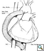Longitudonal aortotomy is made at this point on the right lateral wall of the ascending aorta (identified while the aorta is filled with antegrade cardioplegia). The graft is beveled and tailored to adequate length and orientation, to provide a smooth course around the right margin of the heart, taking care to ensure the graft does not compress the right atrium. A running anastomosis is created with 4-0 polypropolene suture (Figure 3), and the aortic root is deaired through the anastomosis prior to removal of the aortic crossclamp. Final graft configuration is illustrated in Figure 4.