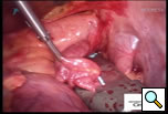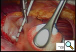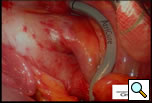 Additional blunt dissection is performed between the right superior pulmonary vein and the right pulmonary artery, lateral to the superior vena cava, to gently separate these structures. Through a separate port site a special articulating lighted dissector (Wolf dissector, Atricure Inc., West Chester, OH) developed for this procedure is placed under the inferior pulmonary vein and articulated to emerge above the superior pulmonary vein but below the pulmonary artery and lateral to the superior vena cava (Figure 3 and Video 1). The lighted dissector enhances the visual feedback of the operator, and the light generally transilluminates the adipose tissue, but not vascular structures, helping the surgeon guide the dissector in the proper plane between the pulmonary artery and vein. Once the dissector is around the right pulmonary veins a red rubber catheter, already attached to the dissector, is advanced, pulling the catheter behind the veins. The lighted dissector is then removed, and saved for use on the left side. The inferior jaw of a non-irrigated bipolar radiofrequency clamp (Isolator™, Atricure Inc., West Chester, OH) which is pre-attached to the other end of the rubber catheter, is directed around the pulmonary veins using the catheter as a guide. Once around the veins, the clamp is positioned on the left atrial cuff (Figure 4). Radiofrequency energy is delivered between two gold-plated electrodes embedded in the jaws of the clamp to create linear, transmural ablation lesions. During the isolation, objective feedback of transmurality is provided to the surgeon by graph and audible signal. Lesions can also be made along Waterson’s Groove, across the dome of the left atrium and down to the anterior mitral annulus with the Isolator clamp and/or an Atricure bipolar pen. A digital graph, located on the front panel of the generator, displays the conductance of the tissue clamped between the device jaws, and an audible signal indicates when the lesion is complete (usually about 8 seconds). Once isolation is complete, PV electrocardiograms are again obtained and pacing and high frequency stimulation are repeated to confirm bidirectional block. A bipolar atrial pacing wire is placed inside the pericardium; the wire and a chest tube are brought out through a port site. The incisions are closed and the patient turned to place the left side up.