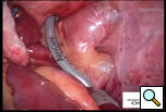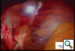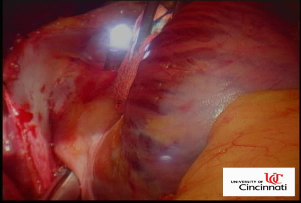 The left chest is then prepped and draped and similar incisions are made, although slightly more posterior (Left Side MiniMAZE). The pericardium is opened posterior to the phrenic nerve, and pericardial stay sutures are placed. After similar mapping of ganglion plexi and PV ECGs, the ligament of Marshall between the left pulmonary artery and the left superior pulmonary vein is divided using cautery (Figure 5 and Video 2). Through a separate port site, the special lighted articulating dissector is placed under the left inferior pulmonary vein and articulated to emerge above the left superior pulmonary vein. The red rubber catheter attached to the dissector is again withdrawn behind the veins. The bipolar radiofrequency clamp is then brought around the left pulmonary veins using the rubber catheter as a guide. The clamp is again positioned on the atrial cuff (Figure 6) and isolation lines are created. Once isolation is complete, PV ECGs are obtained and pacing and high frequency stimulation are repeated to confirm bidirectional block before withdrawing the clamp. Next an Ethicon EZ 45mm thick tissue stapler (green load) (Ethicon Endosurgery, Cincinnati, OH) is introduced through the port. The anvil of the stapler is placed against the left atrium and the left atrial appendage is gently positioned in the jaws (Figure 7). The tip of the stapler usually rests under the left pulmonary artery to include the entire atrial appendage. The stapler is then fired, and the left atrial appendage removed. Bipolar cautery is used to control occasional oozing from the cut atrial edges. A bipolar ventricular pacing wire is then secured inside the pericardium overlying the left ventricle and the pericardium is closed with interrupted sutures. The pacing wire and chest tube are brought out through the port site and the incisions are closed.