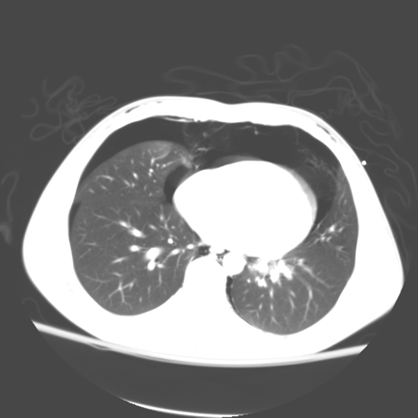 The patient is a 16-year-old male who was a restrained passenger in a car that collided with a guardrail at high speed. He was initially admitted to the referring hospital with no respiratory symptoms and with oxygen saturations over 90%. CT scan revealed a posterior membranous tracheal tear approximately 4 cm above the tracheal bifurcation, pneumomediastinum, and bilateral pneumothoraces. Upon arrival to our Level One Trauma Center, the patient was found to be hemodynamically stable, breathing spontaneously with oxygen saturations of 100% on 2L nasal cannula. His exam was remarkable for subcutaneous emphysema extending from his upper chest to his head, neck and throat. He had a seatbelt bruise across the front of his chest (Figure 1). The remainder of his exam was significant only for a left ankle injury. Review of his CT scan showed extensive mediastinal and subcutaneous emphysema, bilateral pneumothoraces and a posterior linear membranous tracheal tear starting from 2.5cm below the thoracic inlet and extending down 5cm above the carina (Figures 2a and b). Bronchoscopic intubation was performed confirming the CT scan findings and revealing no evidence of distal airway injury. The endotracheal tube was advanced across the area of injury under direct visualization.