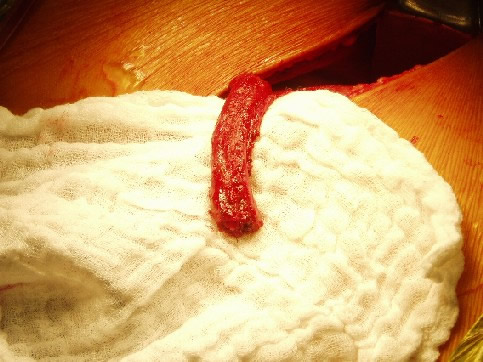 was deflated to allow adequate visualization of the tear. The edges of the trachea were debrided and the tear was repaired with two running 4-0 vicryl sutures starting at either end of the tear and meeting in the middle (Figure 5). At the conclusion of the repair, there was no air leak from the suture line at 30 cm water. Next the intercostal muscle flap was inspected and found to be viable. The flap was then positioned anterior to the esophagus and posterior to the trachea, extending from 5cm above the carina and passing superiorly to the thoracic inlet. Interrupted figure-of-eight sutures of 4-0 vicryl were used to anchor the flap to the cartilaginous portion of the trachea. This provided a well-vascularized buttress for the linear repair in the membranous portion of the trachea. (The pleural surface of the flap was placed against the trachea.) Stay sutures of 4-0 vicryl were placed to anchor the muscle flap to the mediastinal pleural just distal to its origin. Lastly, the mediastinal pleural previously reflected was then loosely approximated over the muscle flap. The endotracheal tube was then returned to a standard position and the right lung inflated. The balloon of the endotracheal tube was deflated and no air leak was seen from the site of the repair. The chest was closed and bronchoscopy was performed to clear the airway of secretions, inspect the repair, which was intact, and to position the balloon of the endotracheal tube above the carina but below the injury.