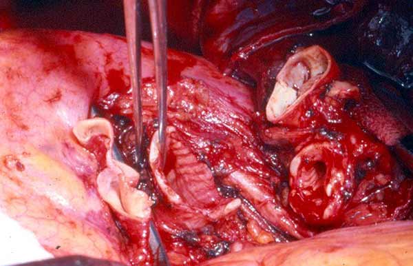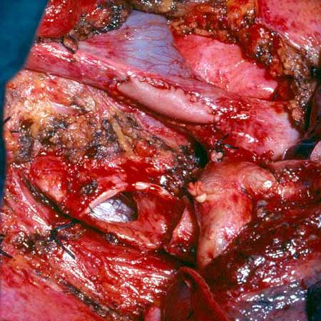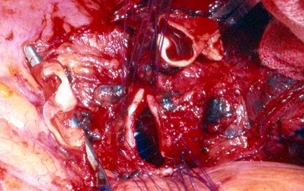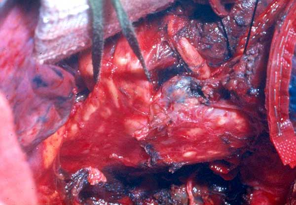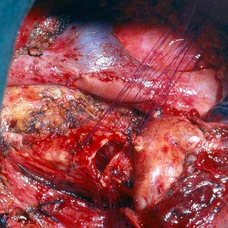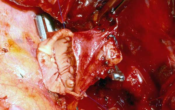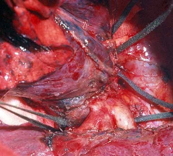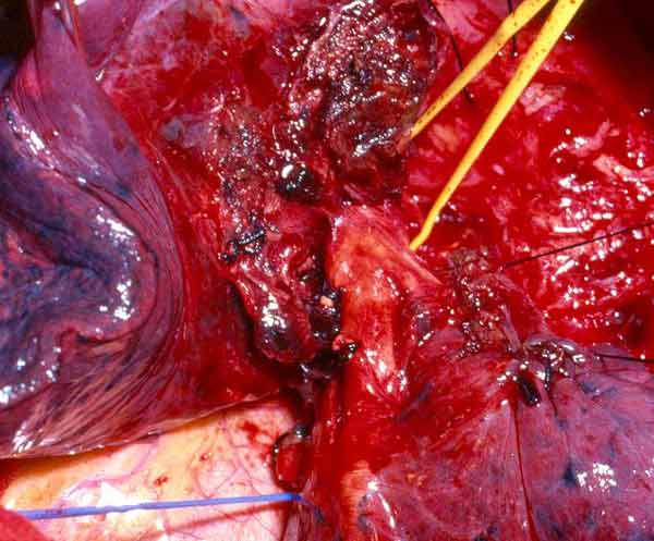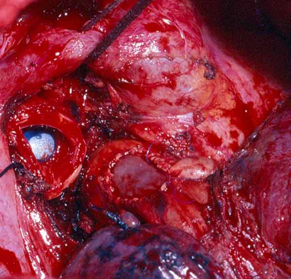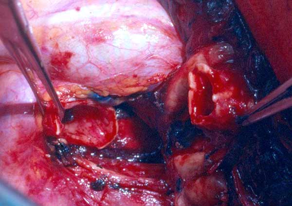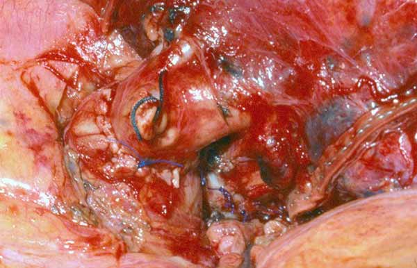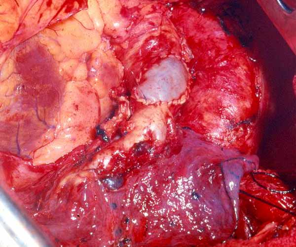 - Because the PA is a low pressure vessel, leakage from the suture line may go unnoticed intraoperatively. Also, the bleeding may start in the first or second postoperative day after a patch reconstruction. A blood loss of up to 800ml to 1000ml daily may occur after 1 or 2 days of no drainage. This may last for 1 or 2 days and then stop spontaneously independent of anticoagulant usage. A possible explanation is that the autologous pericardium shrinks and curls markedly after harvesting, and it is difficult to place the suture bites at the appropriate distance. After declamping and distention, bites too wide apart may result. These would not cause bleeding immediately because the PA is stretched downward by the atelectatic lower lobe, and simple apposition of the tissue edges is enough to overcome the low PA pressure. However, in the postoperative period, when the reexpansion of the lower lobe elevates the hilum, the rotation and kinking of the PA may distort the suture line and open a bleeding site. It is therefore very important, especially when using autologous pericardial patches, to carefully check the suture line and test the PA position after reexpansion of the residual lobe. The latter maneuver is also important to prevent thrombosis. After a patch reconstruction of the PA associated with a bronchial sleeve, the bronchial axis is shortened, and the length remains stationary. Some of the discrepancy is compensated by the elasticity of the vessel, but the PA may tend to kink and fold over itself. The aforementioned repositioning of the PA due to the reexpansion of the lower lobe further increases the risk. Impairment of blood flow may ensue, and thrombosis may be facilitated. Under these circumstances, it is better to cut the distorted segment away and proceed to an end-to-end anastomosis.