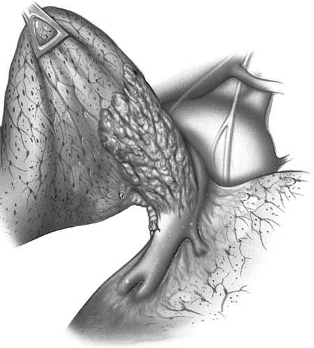| Figure 9: Line drawing (left) and intraoperative image (right) showing the usual pattern of infiltration of the interlobar portion of the pulmonary artery posterior to the left upper lobe bronchus.* | |