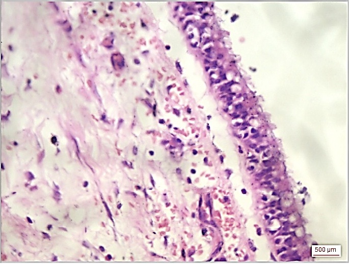 Figure 6. Photomicrograph showing pseudostratified, ciliated, columnar epithelium with prominent cilia on the top.