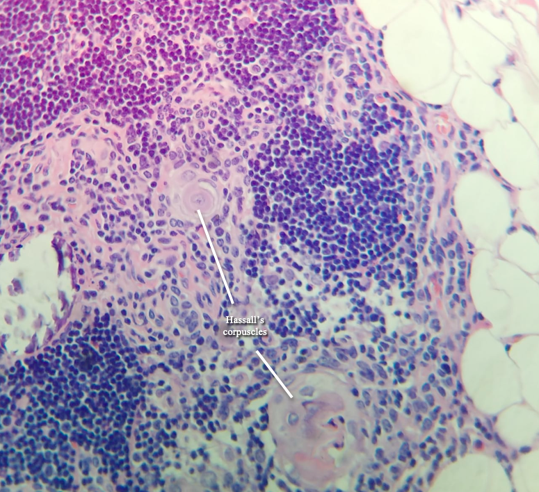 Figure 7. Hematoxylin & Eosin stained section of the thymus, showing thymic involution. No thyroid or parathyroid tissue was found in the thymus. Hassall’s corpuscles are evident in the picture.