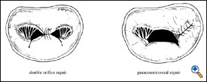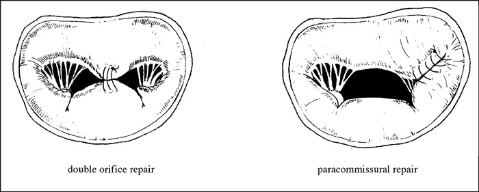 When there is an alteration of the motion of the edge of one leaflet, it can be corrected by suturing together the diseased edge to the normal one. This generates a double orifice valve if the lesion is located at the middle of one or both leaflets, and in a single orifice valve, with a smaller orifice area, when the suture of the leaflets is lateral. We called the first instance double orifice repair, and the second case paracommissural repair.