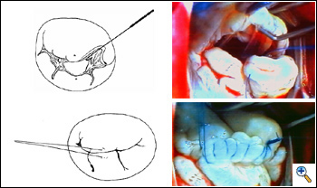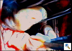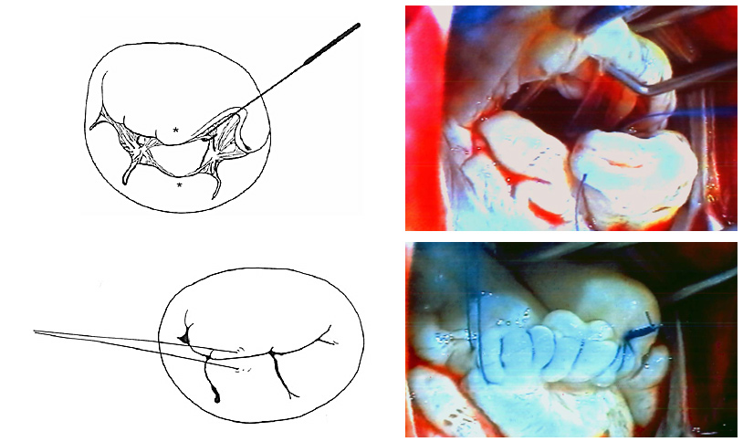 Conventional aortic and bicaval cannulation is performed. The interatrial groove is dissected to improve exposure, however, one of the characteristics of Barlow's disease is the pliability of the tissues, hence valve exposure is usually excellent. Cardioplegia is given and the left atrium is incised and entered laterally. The mitral valve is exposed with a Cosgrove mitral retractor. Inspection is carried on as usual. If the diagnosis of Barlow's disease is confirmed and prolapse is more than 1 cm beyond the annular level, the edge-to-edge repair is indicated. In most cases of Barlow's disease, 4-0 polypropylene suture (double armed prolene SH-1) is usually appropriate, since leaflets are thick and redundant. A 5-0 polypropylene suture may be preferable in case of thin tissues. Pledgets are not necessary.