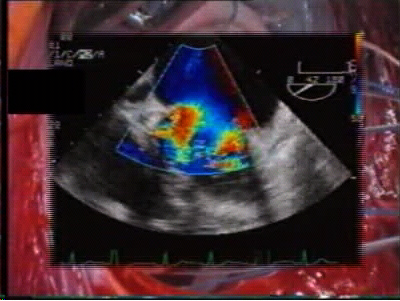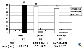 Intraoperative, post-repair TEE is mandatory, as with any other repair technique, to verify the results of the correction. In the specific setting of the edge-to-edge technique, TEE should exclude not only residual regurgitation, but also valve stenosis. Valve area may be assessed by Doppler methods, since flow velocity through the valve is not affected by the type of surgical procedure.4 We mostly rely on planimetric valve area, assessed in the transgastric, short-axis view of the mitral valve. In case of doubts, pressure measurements of the transvalvular gradients may be obtained to exclude mitral stenosis intraoperatively. Mid-term follow-up TEE data showed good results of the repair, with stable competence and no progression of valve stenosis (see chart3). Exercise Doppler-echocardiography may be useful in case of suspicion of mitral stenosis at baseline examination. It must be noted that following double orifice repair, valve area is flow dependent (functional reserve), since it increases during exercise, as for the native mitral valve.5