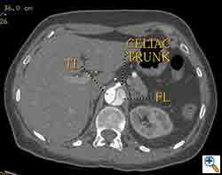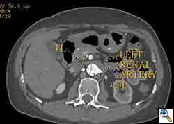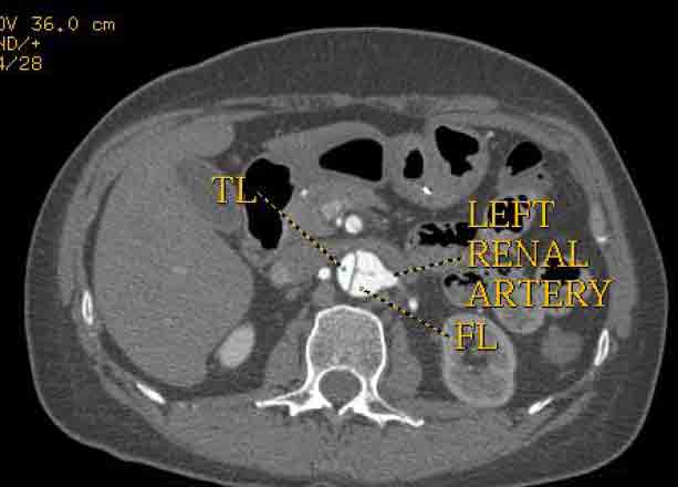 The patient was taken to the hybrid operating suite and a thoracic aortogram was performed. The aortogram confirmed the chronic Type B aortic dissection with a patent false lumen and a fenestration just beyond the left subclavian artery. An intravascular ultrasound (IVUS) was also performed of the entire aortic arch and descending thoracic and abdominal aorta. The IVUS also confirmed that there was an adequate proximal landing zone beyond the left subclavian artery consisting of normal aorta where we would be able to achieve adequate seal of the endovascular stent graft. The septal fenestration began approximately 1.5 cm distal to the left subclavian artery. The true lumen was compressed distally. (Figure 2) The celiac artery appeared to come off the true lumen. (Figure 3) The dissection extended into the superior mesenteric artery and the artery was perfused from both the true and false lumen. (Figure 4) The left renal artery came off the false lumen. (Figure 5) The right renal artery came off the true lumen.
