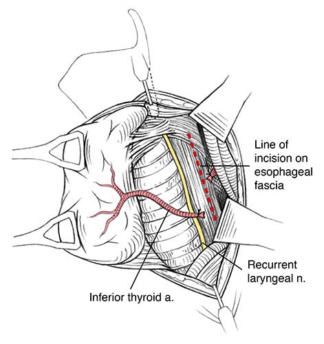 While performing this dissection a critical step is to provide specific downward counter traction on the thyroid lobe to prevent stretch injury on the nerve, which can easily occur if, in the process of retracting the esophagus superiorly, the laryngotracheal complex is pulled up as well. This circumferential dissection of the esophagus can be carried inferiorly into the posterior superior mediastinum when being performed for esophagectomy and superiorly as needed for other operations on the esophagus. When the (thoracic) esophagus is brought up into the neck and transected, specific attention to this downward traction must be maintained to prevent recurrent nerve injury.