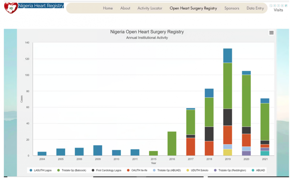 We are hoping that we can get further help from educational bodies, surgical associations, charities, or industry to pay for a couple more years. This will help remove some financial pressure so that we can keep developing and populating the Nigeria Heart Registry. Below is a screenshot from the Nigeria Heart Registry showing a graph of the activity from participating institutions from 2006 – 2021.