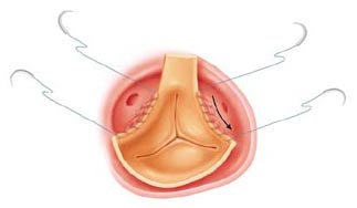 A pledgeted "U" suture is placed at the base of the commissure.
