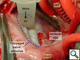 Figure 8 shows the view of the open right atrium taken from the head of the table. The superior vena cava (SVC) and inferior vena cava (IVC) are identified. There is a catheter tip in the mid-portion of the right atrium. The tricuspid valve has been outlined with a dotted blue line. The Gerbode ventriculo-atrial defect is indicated.
