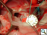 Figure 11 shows the placement of 5 pledget-supported Ticron sutures around the circumference of the ventriculo-atrial defect.