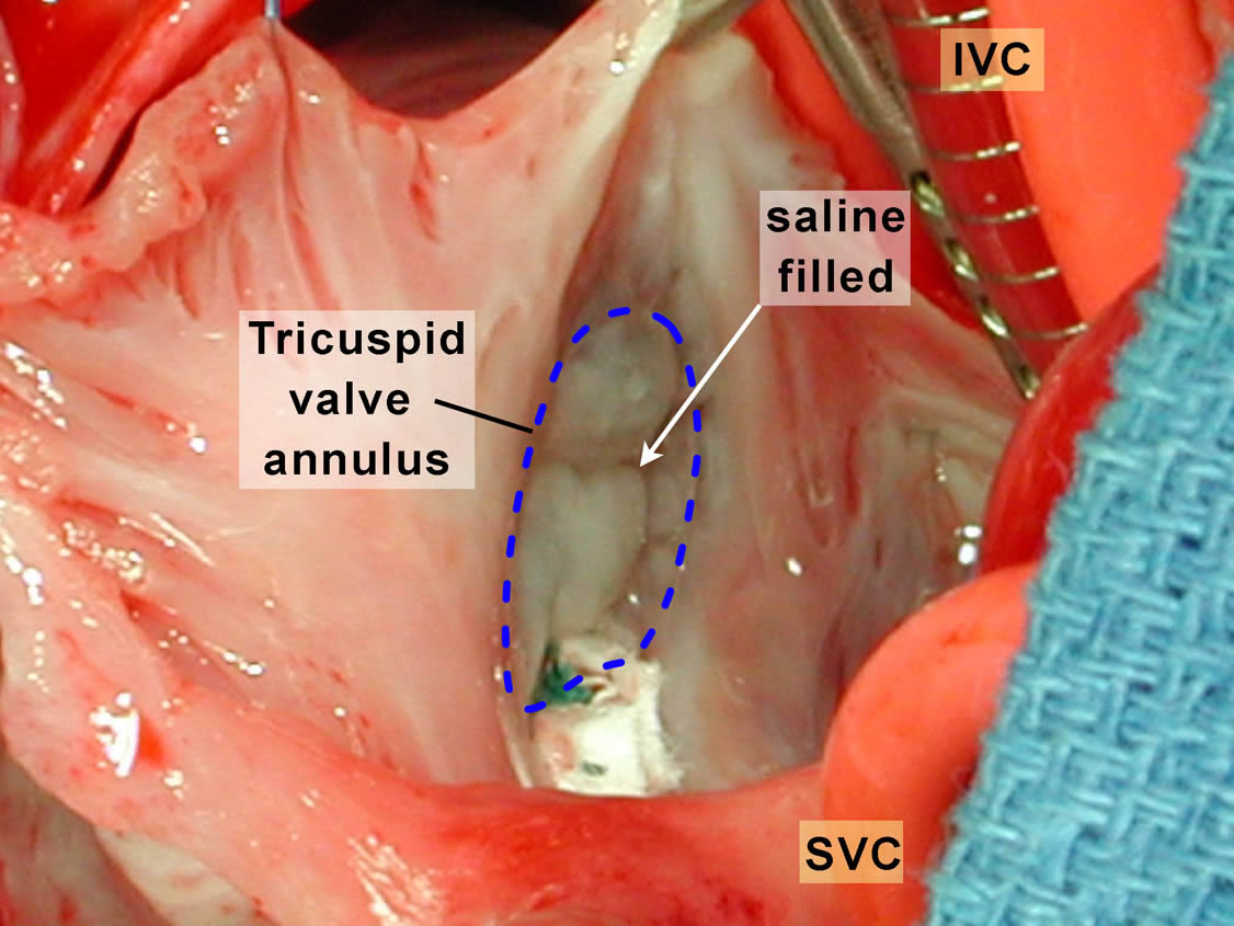 Figure 13 shows the completed repair with the tricuspid valve again filled with saline and demonstrating that the tricuspid valve is competent.