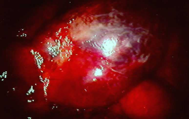 | Figure 1: Operative view at thoracotomy of a single bulla with normal underlying lung. | Figure 2: Operative view at thoracotomy of multiple bullae with underlying lung with diffuse emphysema. |