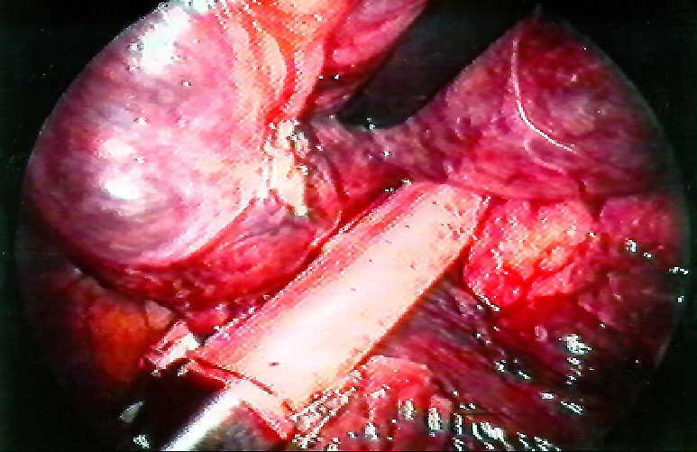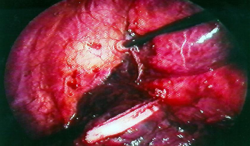 VATS bullectomy is performed under general anesthesia with double lumen endotracheal intubation. After discontinuing ventilation to the operated side, the first incision is usually made at the level of the 6th or 7th intercostal space in the midaxillary line. Careful inspection of the bulla and underlying lung parenchyma may be difficult since large bullae are usually under tension and obliterate the pleural space. The other two incisions are performed to achieve a "triangulation approach" and are used to place graspers and staplers. Pleural adhesions are coagulated and divided to completely mobilize the lung and bulla/bullae. The use of a thoracoscope with a working channel may further help to have an additional port available for instruments. The bulla can be incised and deflated to facilitate gentle manipulation of the lung; it is usually squeezed and twisted ("spaghetti procedure") to identify the base. Traction on the surrounding parenchyma must be carefully performed to avoid injuring the lung surface with consequent prolonged air leaks during the postoperative period. Pedunculated bullae are easily excised with endostapling devices. Broad-based bullae can be removed with multiple applications of endoscopic staplers (Figures 10-12). The bulla is usually excised with a rim of "normal" lung parenchyma to avoid leaving open bronchioles. When removing bullae with underlying emphysematous lung, the stapler line is usually reinforced with commercially available strips6. Additional small bullae and blebs in the residual lung are either excised or coagulated.