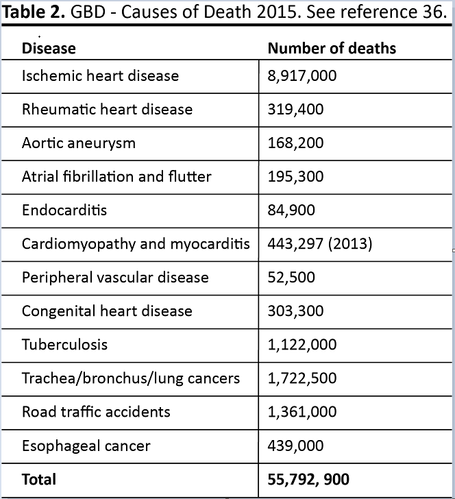 In 2015 there were 55,792,900 global deaths, with 10.5 million among children. The top five causes of death globally were ischemic heart disease (IHD) (7.2 million deaths), stroke (5.5 million), injuries from all causes (4.7 million), lower respiratory diseases (3.9 million), and HIV/AIDS (2.7 million) (36, 37).