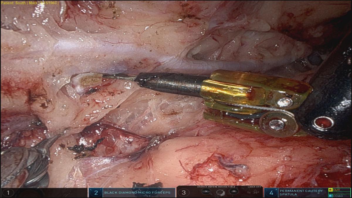As a first step, it is good practice to check the robot arms’ range of motion and review any conflicts. It is recommended to use a Bovie spatula in the right hand and Micro Diamond fine forceps in the left hand. Clips and scissors are used as needed. Later, the surgeons will switch to DeBakey forceps for taking down pericardial fat and opening up the pericardium. LIMA takedown is performed with robotic scope in 30 degrees up.