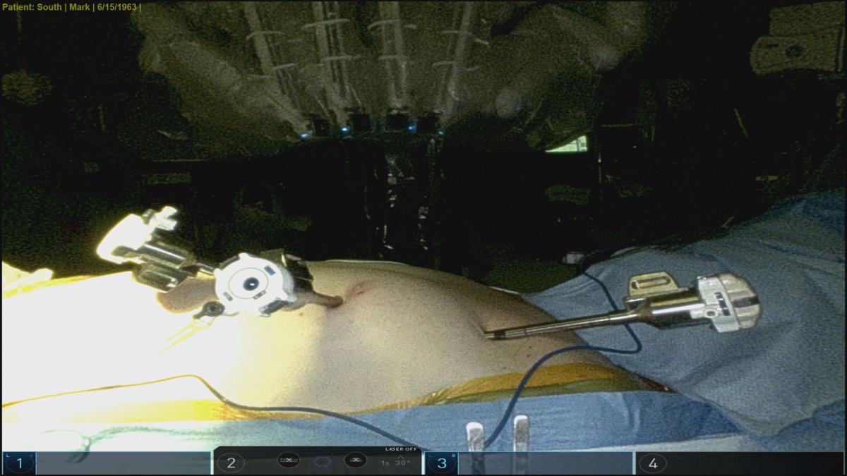 Next, all instruments are removed and the camera is pointed toward the subxiphoid space. In thin patients, one can clearly see the site for external incision in the subxiphoid area externally, by illumination from the camera. The incision is generally a centimeter or two from the subxiphoid area and, initially, a Kelley forceps is inserted under robotic vision. This is followed by insertion of a stabilizer rod.