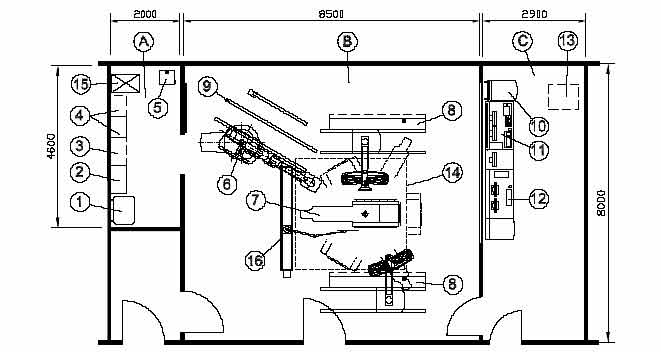 Pos. A. Equipment room Pos. B Examination room Pos C. Control room