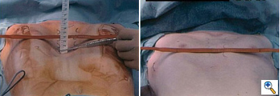 | Figure 2. A sterile marking pen marks the skin at the interspaces of maximal pectus depth on each side of the sternum. In this example, the pectus depth measures 4.5 cm. |