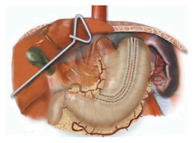 In the supine position, the double lumen ETT is exchanged to a single lumen tube, then 5 abdominal ports are placed on the anterior abdominal wall similar to the approach for a laparoscopic Nissen fundoplication: one cut-down 10 mm port in the right epigastrium and four 5 mm ports in the bilateral subcostal, left epigastrium and right flank locations (Figure 2). The left lobe of the liver is retracted upward to expose the esophageal hiatus using a Diamond- Flex retractor and held in place with a self-retaining system placed on left side of table. With the patient in maximal reverse Trendelenburg position, the dissection begins by dividing the gastrohepatic ligament and exposing the right crus of the diaphragm. The short gastric vessels are ligated using the ultrasonic shears and large endoclips. No clips are placed on the gastric side of the short gastric vessels to avoid potential displacement during the gastric pull-through. The dissection continues along the greater curvature of the stomach, preserving the right gastro-epiploic arcade. The stomach is retracted superiorly allowing lymph node dissection of the celiac and gastric vessels. Once the gastric artery and vein are exposed, they are divided using the EndoGIA II vascular stapler.
