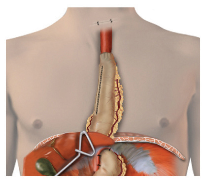 A 4 to 6 cm collar incision is made slightly to the left of midline above the suprasternal notch and the cervical esophagus is mobilized and exposed. Finger dissection is continued distally until the thoracic dissection plane is encountered. The esophagus is divided using the auto-pursestring device (typically size 45) and the esophagus is pulled up out of the wound. As traction is applied to the specimen from the neck, another surgeon laparoscopically guides the specimen in its proper alignment into the mediastinum. The specimen is removed from the field. An anastomosis is performed between the esophagus and the gastric tube using a 21- or 25-mm EEA stapler placed through a small anterior gastrotomy or handsewn. The gastric tube is reduced into the abdomen under laparoscopic guidance and approximated to the diaphragm anteriorly and bilaterally with three 2-0 endostitches. The completed reconstruction is shown in Figure 5.