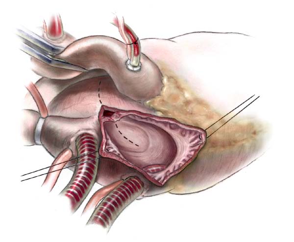 - Traction is on both sides of the RA appendage and one on the medial side of the transverse portion of the right atriotomy to splay open the RA. These are typically placed before the LA incisions. Two more tractions are placed on the medial side of atrial septal incision and retracted to the patients left. These are also shown in the figure