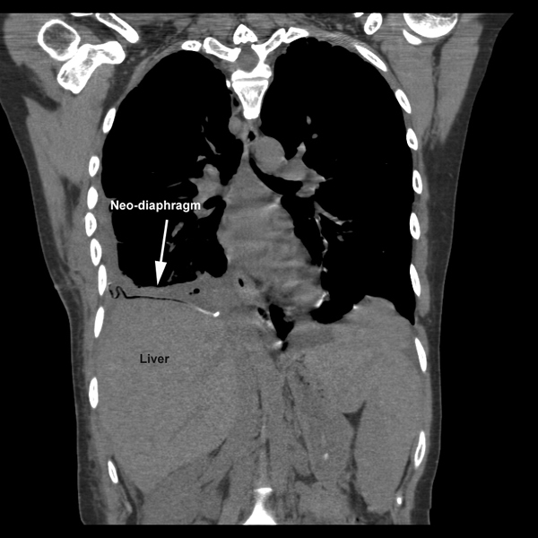 Figure 8: Postoperative chest CT scan reveals neo-diaphragm and reduction of the liver back into the abdomen. |