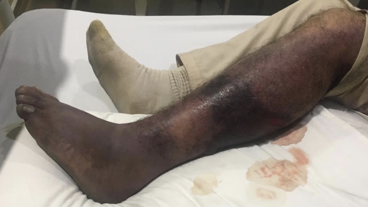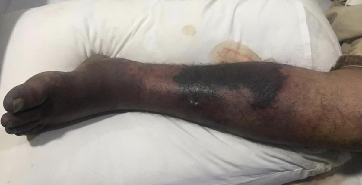 Upon examination, the patient was not sitting comfortably in his bed with a mild cough and left lower extremity pain. Vitally stable. Systemic examination was unremarkable. Lower left limb examination revealed (Figure 1 and 2) grossly edematous limb, gangrenous with necrotic skin patches, purple in color, cold up to the knee, pulses were palpable in the femoral region while doppler signals were very weak below the popliteal artery, weak motor response and intact sensory responses. The right lower limb was normal.