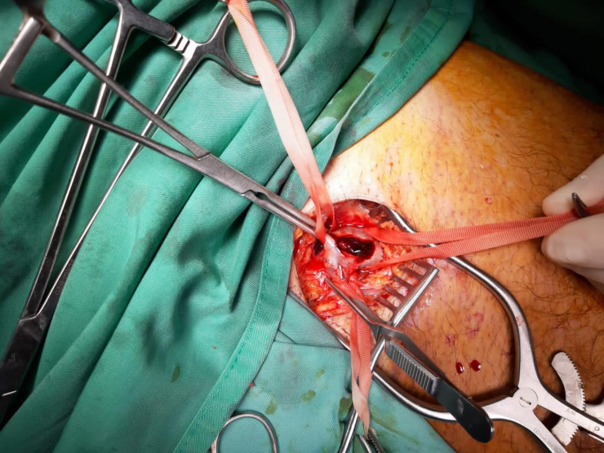 Left inguinal incision was given and femoral vein exposed. Proximal and distal control attained, and vein opened. A large clot was visualized with no venous flow (Figure 3). Thrombectomy was done using suction and fogarty (Video 2). Also, distal compression of leg was done to mobilize the thrombus. Both proximal and distal veins approached. Free venous flow was established. Veins closed with 6/0 prolene.
