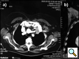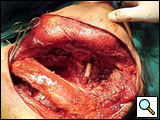 | Figure 10. Chest CT-scan shows the invasion of the subclavian artery by Pancoast tumor. | Figure 11. The invaded artery was resected and replaced by a PTFE graft through a posterior approach. |
