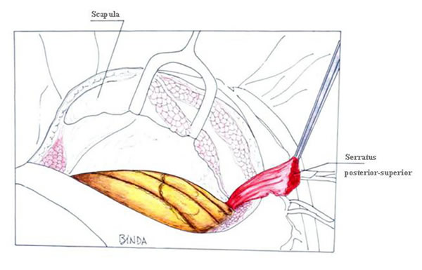 | Figure 5: Shaw-Paulson’s thoracotomy. | Figure 6: Diagram of the flap of serratus posterior superior muscle. |