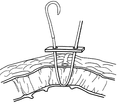 Proximal occlusion of target vessel is accomplished with an encircling suture or silastic tape passed widely around the vessel proximal to the site chosen for anastomosis. No distal occlusion is necessary (Figure 9). The use of intracoronary shunts is recommended whenever possible, especially for LAD and RCA. These are very useful when hemodynamically significant ischemia develops (Figure 10). The anastomosis is performed in a routine manner according to the surgeon's preference.