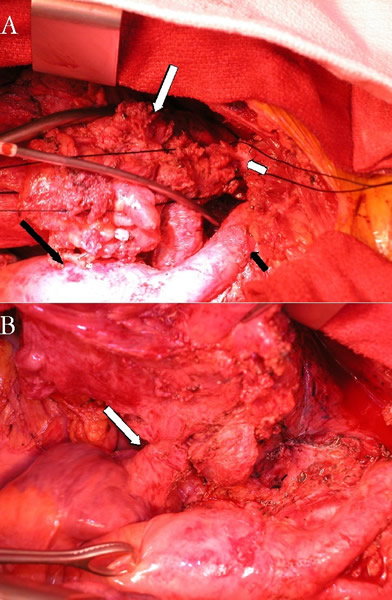 The patient was taken to the operating room and sternotomy performed after division of several large collateral chest wall veins. The pericardium was opened and resection of all thymic tissue was undertaken starting at the diaphragm (Figure 3). The SVC was transected at the confluence of the right subclavian and jugular veins and found to be filled with fibrotic tissue (Figure 4A). Frozen section examination of the luminal contents identified benign fibrotic tissue. The SVC was mobilized to the level of the right atrium en-bloc with the tumor, the azygos vein was divided, and a wedge resection of the medial aspect of the right upper lobe was performed. At this point, the tumor had been completely mobilized except for an intravascular extension through the SVC into the right atrium (Figure 4B).