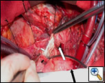 The patient was placed on cardiopulmonary bypass via the aorta and inferior vena cava. The SVC was resected with the atrium and the tumor removed en-bloc (Figures 5-7). The atrium was closed and the patient weaned off cardiopulmonary bypass. The patient was extubated on postoperative day 2 and discharged home on postoperative day 7. Final pathology revealed a malignant thymoma with vascular and lung invasion.