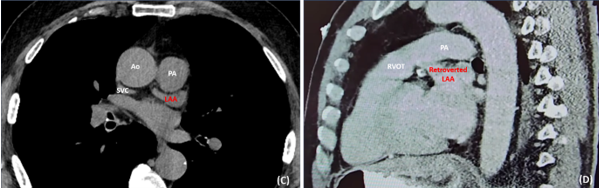 C and D are axial and sagittal CT images, respectively, showing a retroverted LAA lying posterior to the RVOT, PA and aorta; CT, computed tomography; LAA, left atrial appendage; PA, pulmonary artery; RVOT, right ventricular outflow tract; and SVC, superior vena cava.