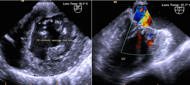 Fig. 3A: Mitral valve leaflet: thickened, redundant. Moderate central regurgitation. Subvalvular apparatus: nodular, thickened, fused.
