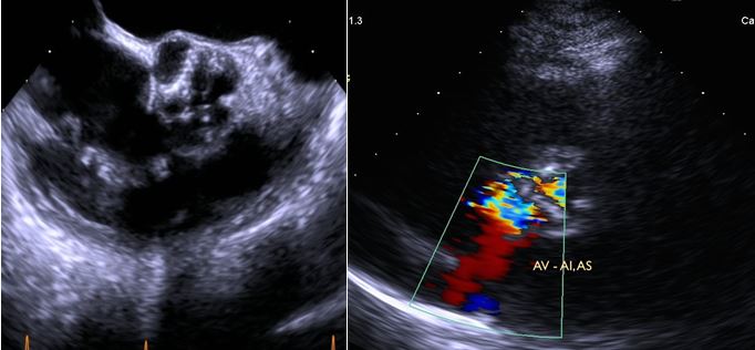 The valve was beyond repair. Most of the anterior leaflet was excised and the commissural support was left intact. The mitral valve was replaced with a 27 mm SJM with no untoward problems. The previously sized aortic root of 21 mm was only able to accommodate a size 19 mm SJM valve for proper seating. Intraoperative testing showed well-seated and functioning valves, complimented by intraoperative TEE.