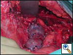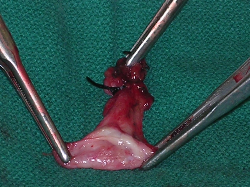 The patient was taken to the operating room where a standard median sternotomy was performed. Inspection revealed a left brachiocephalic vein that was completely obliterated and non-functioning. The SVC was normal at its junction with the right atrium, but at approximately mid level it was noted to be scarred and atretic to the level of the right internal jugular and right subclavian veins (Figures 2 and 3). Simultaneously the left saphenous vein, from inguinal canal to the ankle, was harvested endoscopically (Figure 4). Once harvested the vein was incised and opened longitudinally along its entire length. Using a standard 2-stage venous cannulae, a spiral vein graft was constructed using running 7-0 prolene suture, exchanging suture with each completed turn (Figures 5 and 6). The vein graft was left on the end of the cannulae and using a parachute technique an end-to-end anastomosis was first created in the distal SVC at the confluence of the right internal jugular and subclavian veins. The proximal anastomosis was constructed below the level of the obstruction at the entry area of the azygous vein. Following de-airing, inspection revealed the vein graft to be widely patent with no thrill or kinking (Figure 7). The patient was discharged home with coumadin with goal INR of 2.0 for 6 months. At six month follow-up, the patient reports significant improvement in her symptoms.